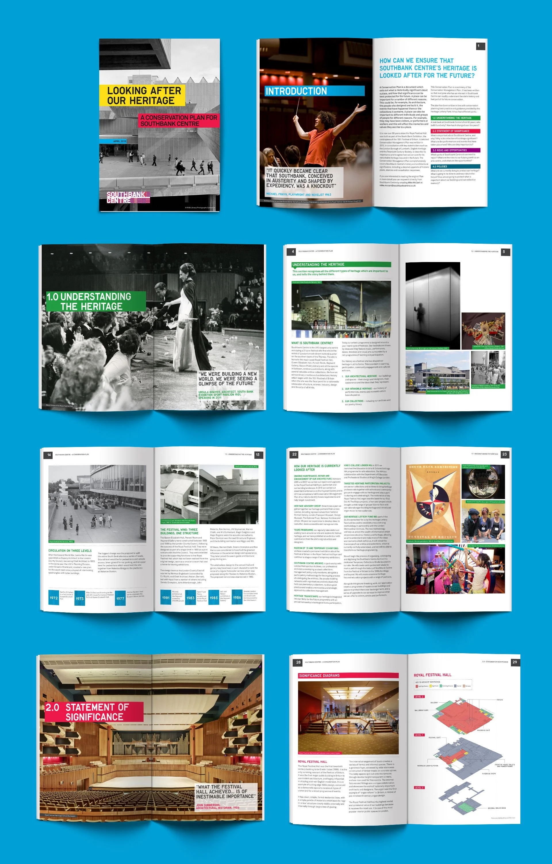 Using the Southbanks eye catching branding, a colourful and impactful document was designed to compliment the range of photography, diagrams and technical content. The dynamic layout was developed to break down the complex information into digestible sections, allowing the document to be visually compelling and accessible. The Conservation Plan successfully supported the application which secured the Heritage Lottery funding.
